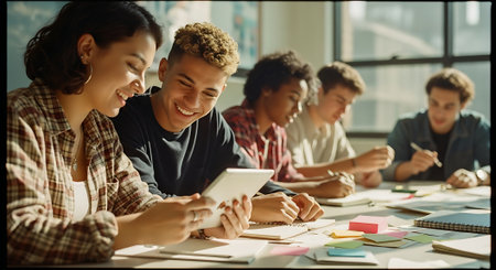 Diverse young teenage student friends learning together at technology class