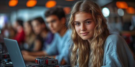 a group of teens working on a robotics project, assembling parts and coding on a laptop, with focused expressions and room on the right for informational text