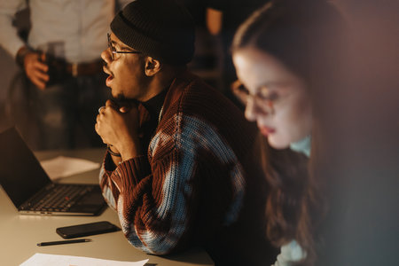 Two colleagues working intently in a dimly lit office space, expressing determination and teamwork while focusing on their tasks.