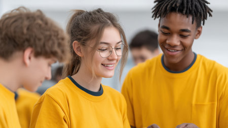 A group of cheerful young students collaborates in a modern classroom wearing bright yellow t-shirts, fostering creativity and team spirit through engaging activities.