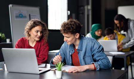 Group of young students studying together in a classroom. Education concept.