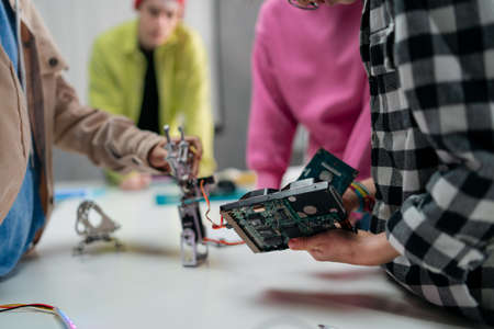Group of high school students building and programming electric toys and robots at robotics classroom
