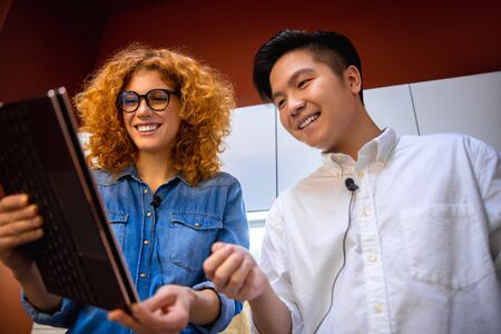 Young female student looking at screen of laptop of Asian male classmate at lesson of computer science while sitting next to him at lesson