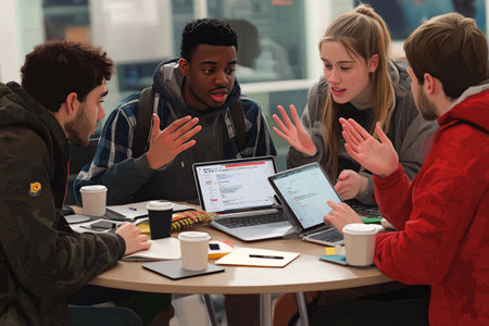 A diverse group of people are gathered around a table with laptops, engaged in deep discussion and collaboration on various projects and ideas. Generative AI