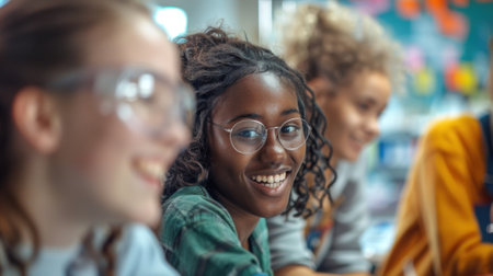 A group of diverse students working on a project together in a modern classroom