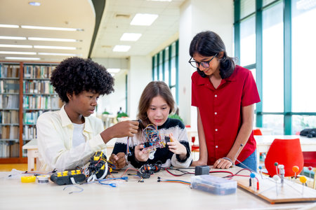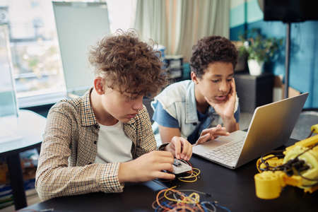 Two teenage kids building electric robots while enjoying engineering class in school, copy space