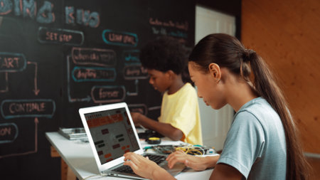 African student fixing main board while smart girl coding engineering prompt or programing system by using laptop at blackboard with web develop plan written in STEM technology class. Edification.