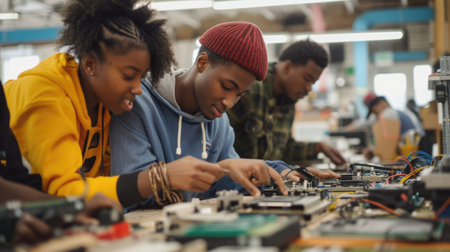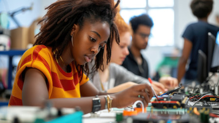 Young engineering students collaborate on an electronics project in a technology lab, soldering circuit boards and sharing ideas. AIG41