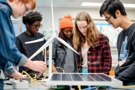 Multiethnic group of students using a wind turbine in a science class