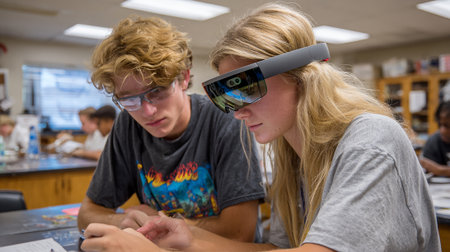 Teacher and students using virtual reality glasses in a classroom at school
