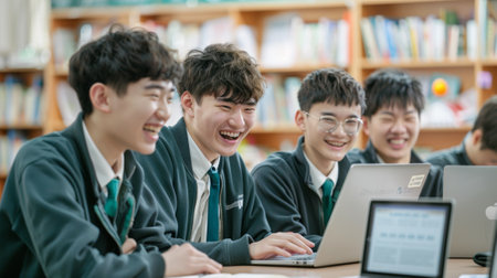 Three teenagers smile while working on laptop in vibrant learning space. Bright, spacious environment with technology and collaboration. Concept of education, teamwork, innovation.