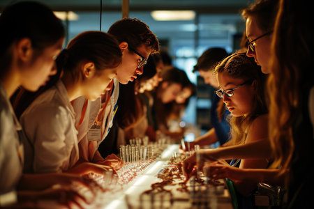 Out of focus capture of students chatting and laughing as they work on their creation