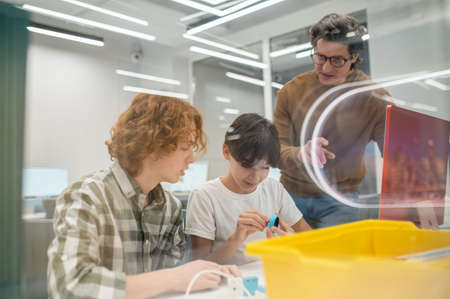 Portrait of young female teacher helping kids using 3D printer during robotics and engineering class at school