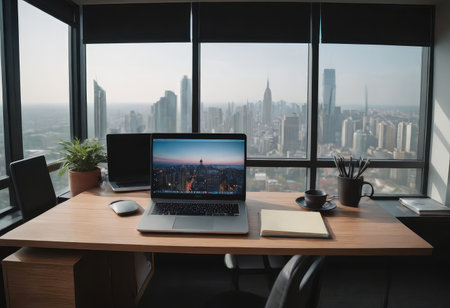 A contemporary office environment with a laptop displaying charts, a coffee cup, and large windows allowing natural light.