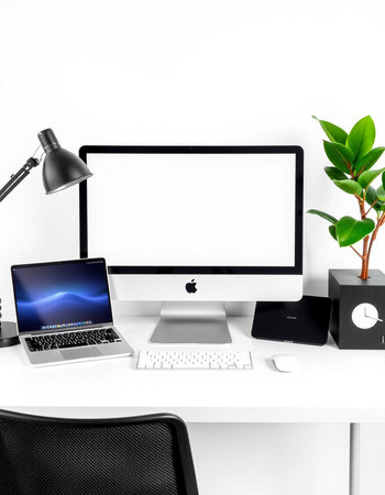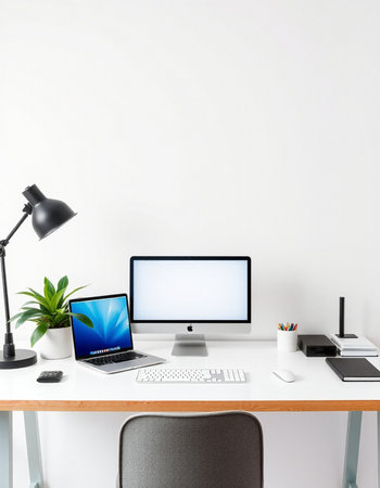 Modern workplace with computer on white wall background. Workplace in office