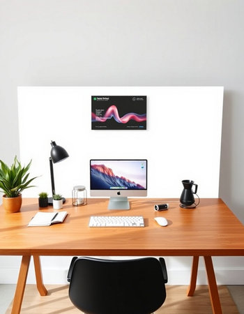 Contemporary digital rendering that conveys a productive and inviting mood through precise composition and subtle warm illumination. Suited for interior design showcases, coworking space promotions, professional lifestyle visuals, and branding for remote teams or creative firms. Its clean lines and harmonious elements offer flexibility for web banners, social media g... AI-generated illustration.