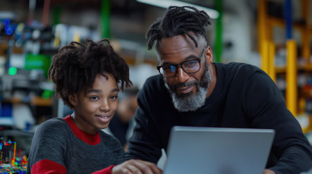 Cute african boy learning to use electronic tool while laptop display code while teacher talking about writing engineering prompt. Diverse children coding program to fixing car model. Edification.