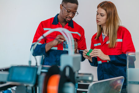 Product design engineer collaborates with industrial designer on 3D printing project in engineering workspace. Interdisciplinary teamwork, innovation, design and engineering in product development