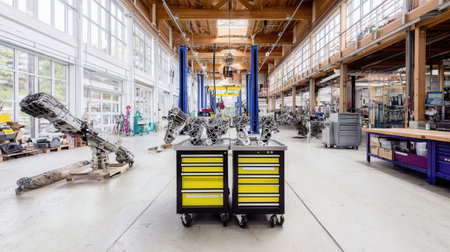 This vibrant engineering workshop features modern technology and organized workspace, equipped with computers and advanced tools, promoting innovation and productivity.