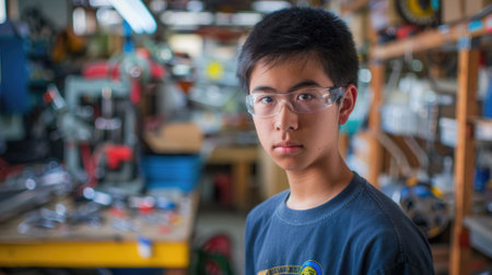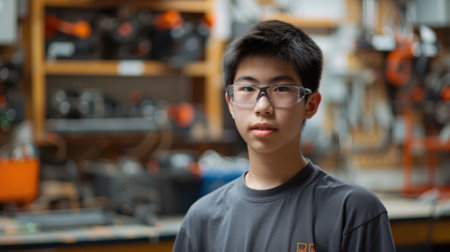 The picture of the east asian male teenager that wearing the safety goggle inside workshop about robot or technology, the robotics engineer require skill electrical and mechanical engineering. AIG43.