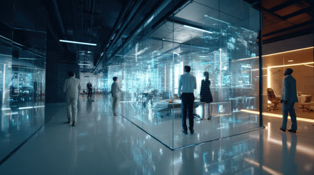 Business people interact in a sleek futuristic office featuring AI-powered holographic screens and cinematic lighting, enhancing collaboration and engagement.