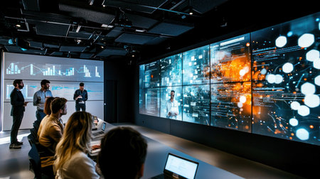 A group of individuals in a control room, with their backs to the viewer, intently watching complex data visualizations on multiple large display screens.