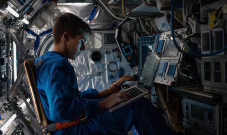 young man astronaut sitting inside space ship or international station with laptop or console with control panel, male engineer and cosmos science research and exploration. High quality photo