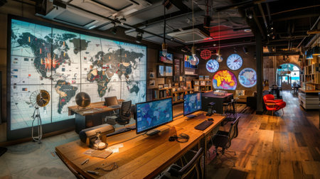 A vibrant modern workspace showcasing world maps, digital screens, and unique clocks. This setting fosters creativity and collaboration, inspiring innovation and exploration.