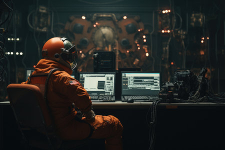 A man in a space suit sits in front of a laptop computer, engaged in his space mission, An astronaut communicating with the control room, AI Generated