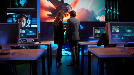 Advanced cyber attack simulation expert team in bright modern training room with neon accents