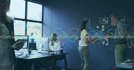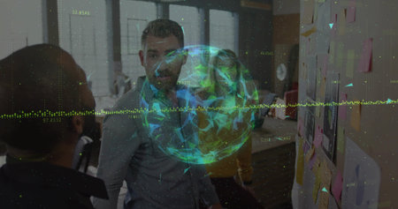 Collaborating professionals studying sticky notes wall in meeting room, with digital globe hologram. Innovation, teamwork, brainstorming, data visualization, modernoffice, collaboration, digitaltechnology