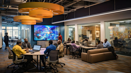 A bustling workspace where teams collaborate creatively showcasing modern office design and teamwork.