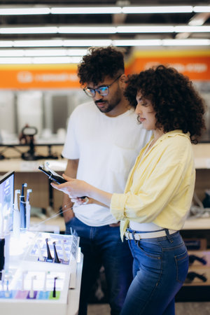 A man and woman explore various gadgets in an electronics store, engaging with displayed products under bright lighting.