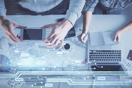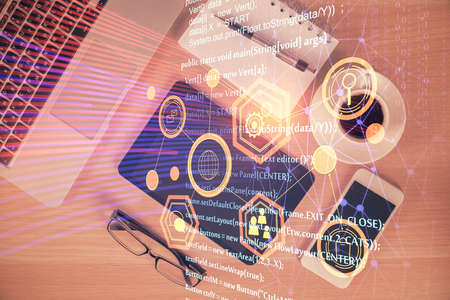 Double exposure of technology theme drawing over work table desktop. Top view. Global data analysis concept.