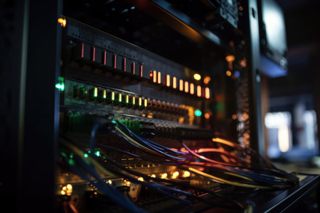 close-up of server rack with blinking lights, cables, and hardware visible, created with generative ai