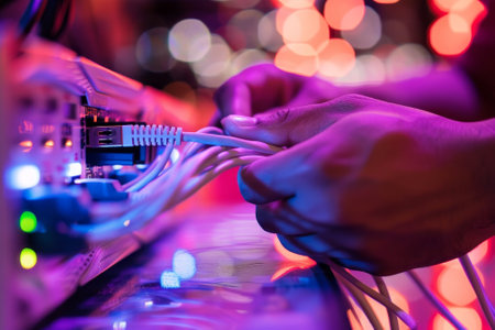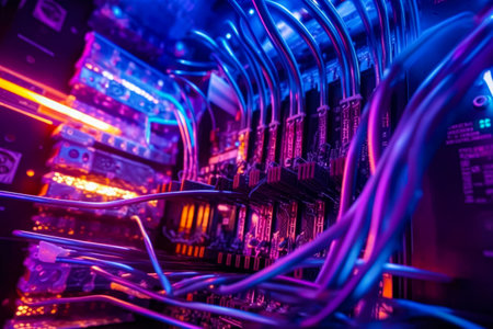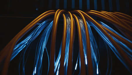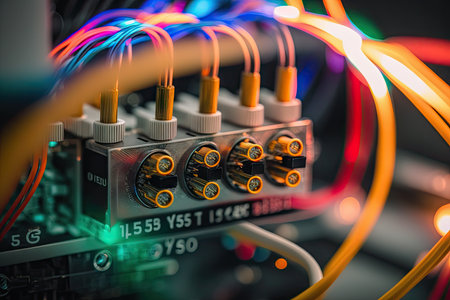 close-up of fiber optic cables being connected and arranged within a 5g network, created with generative ai