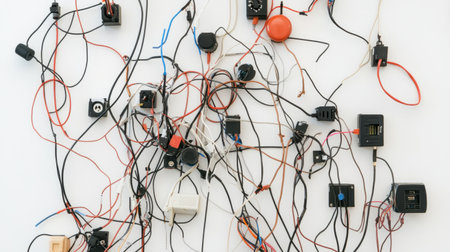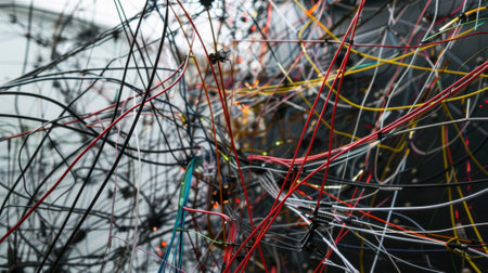 A visually striking arrangement of tangled electrical wires and components showcases the complexity of modern technology and engineering design.