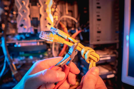 Cutting the Internet cable tied into a knot with wire cutters. The concept of disconnecting the Internet and restricting access to resources