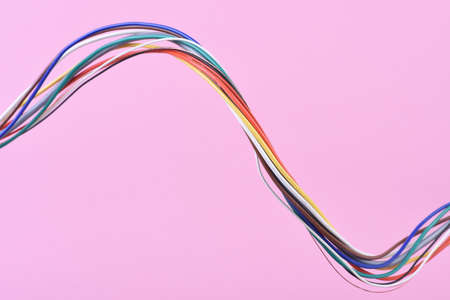 Multicolored electric computer cable on pink background