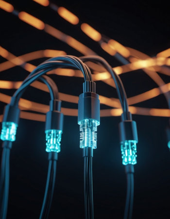 Blue and orange glowing wires twisting and intertwining against dark background with bokeh lights. Black cables and connectors with glowing lights and circuits connect to form a network. AI generated.
