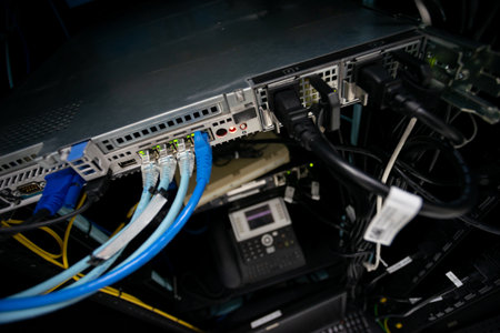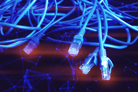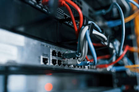 Close up view of internet equipment and cables in the server room.