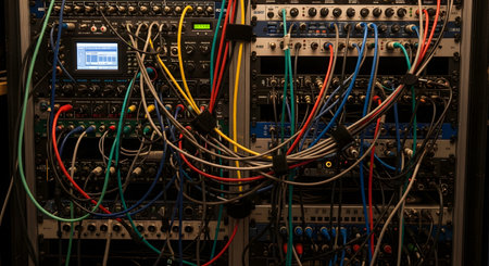 A close-up view of a professional audio or server rack filled with equipment, showcasing a complex and chaotic tangle of multi-colored cables. This image represents the complexity of technology, network infrastructure, and sound engineering setups.