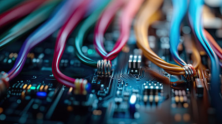 Colorful wires neatly plugged into a circuit board, sitting on a black background, showcasing the connection points and intricate tech details.