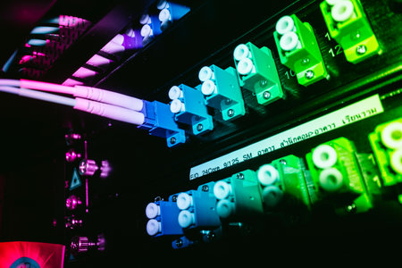 A close-up view of fiber optic connections in a dark server room, showcasing vibrant colors and intricate details of technology and infrastructure. Perfect for illustrating modern data solutions.