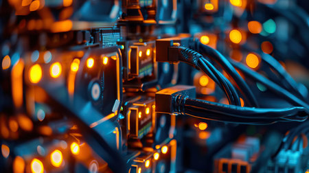 Macro shot of glowing network server hardware with Ethernet cables and LED indicators, symbolizing data transfer and connectivity.