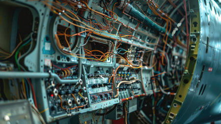 Intricate aircraft wiring and electronic components inside airplane fuselage