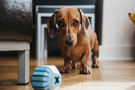 Smooth brown miniature dachshund inviting the owner to play with him, rubber toy ball on the floor in front.