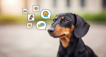 A charming dachshund dog is depicted with thought bubbles featuring various emojis and images. This playful representation captures the essence of pet communication and emotions. ai generated.