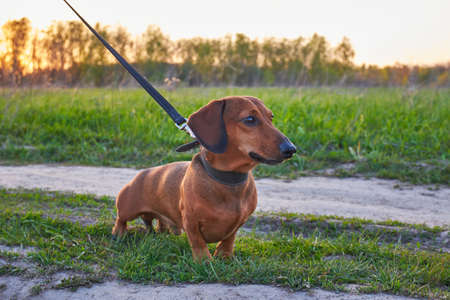 Evening walk with the dog. Brown smooth-haired dachshund in a field at sunset