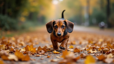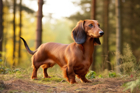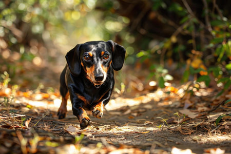 Playful dachshund dog enjoying a walk in a sunlit forest path